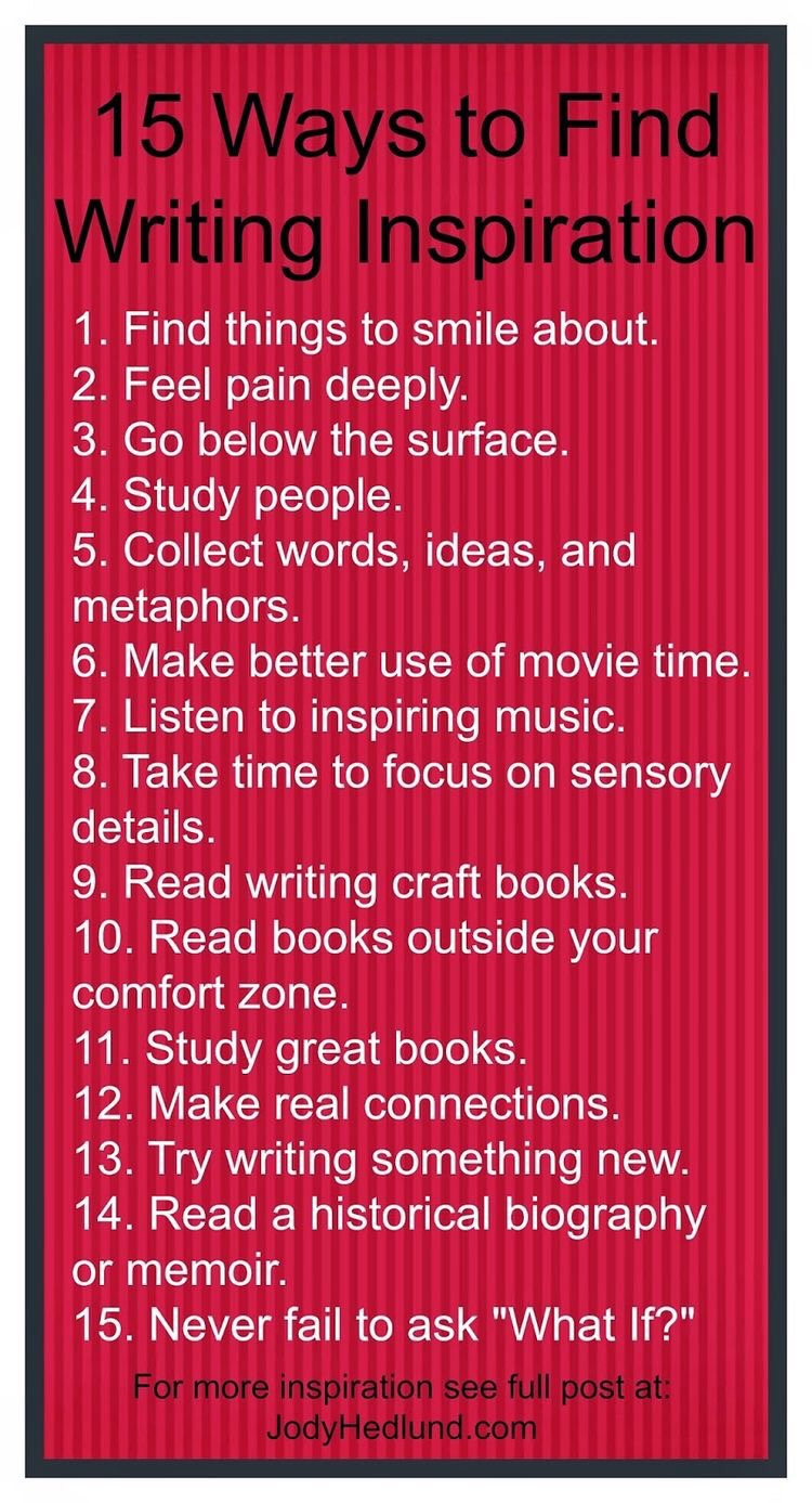 15 Ways to Find Writing Inspiration Share this: Click to share on X (Opens in new window) X Click to share on Facebook (Opens in new window) Facebook Click to share on Tumblr (Opens in new window) Tumblr Click to share on LinkedIn (Opens in new window) LinkedIn Like Loading... Related